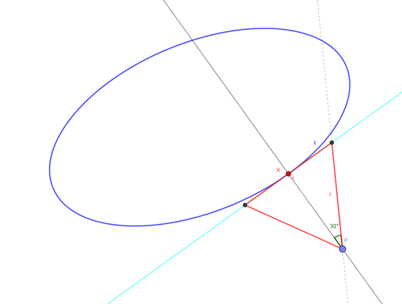 Sea c una cónica y P un punto no perteneciente a ella. Determinar un punto X de c de forma que la tangente en él, determine un triángulo equilátero donde la recta PX pase por su centro.